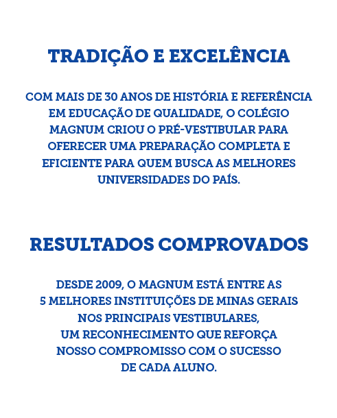 Desde 2009, o Magnum está entre as 5 melhores instituições de Minas Gerais nos principais vestibulares, um reconhecimento que reforça nosso compromisso com o sucesso de cada aluno.